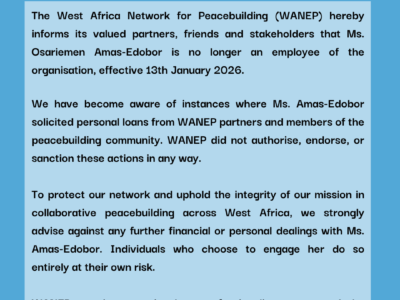 The West Africa Network for Peacebuilding (WANEP) hereby informs its valued partners, friends and stakeholders that Ms. Osariemen Amas-Edobor is no longer an ...